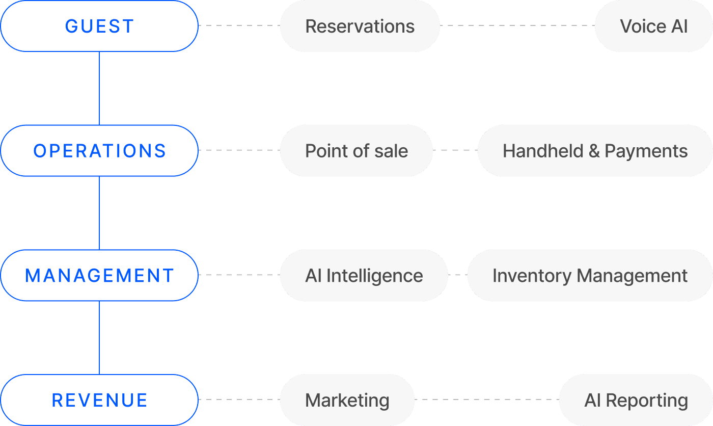 The average restaurant runs on five or six different systems that barely talk to each other. A POS from one company. Reservations from another. Payments from a third. Every system its own login, its own bill - and none of them sharing data.
