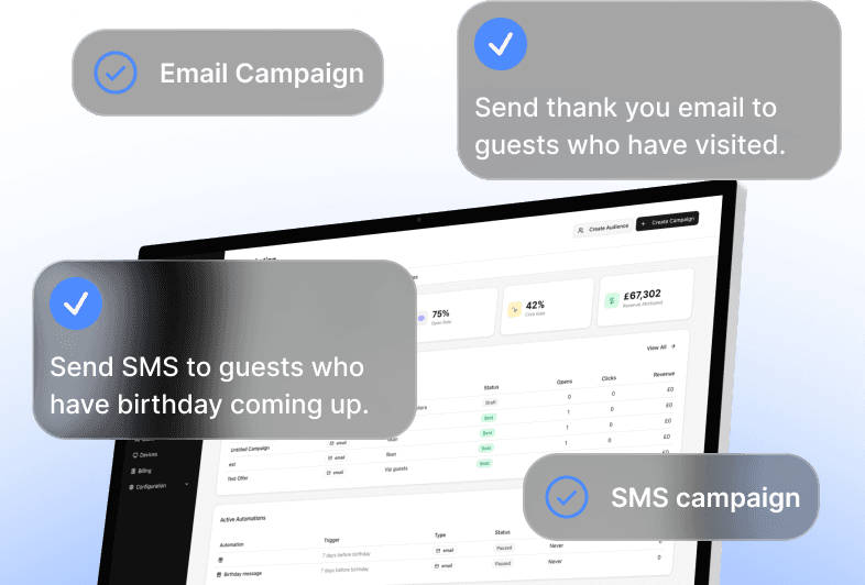 Set up birthday offers, lapsed guest flows, and post-visit messages — running in the background every day.
