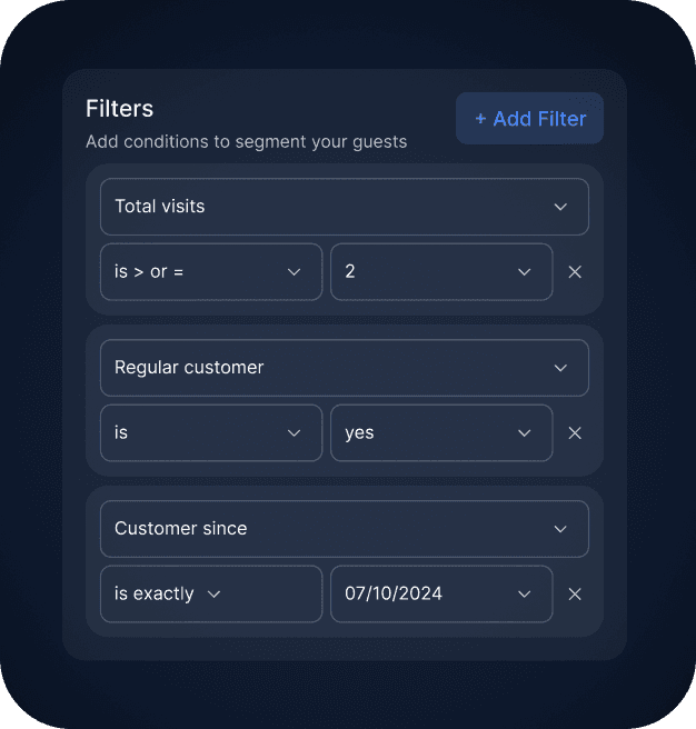 Filter by visit frequency, spend, location, or behaviour — and reach exactly the right guests at the right time.