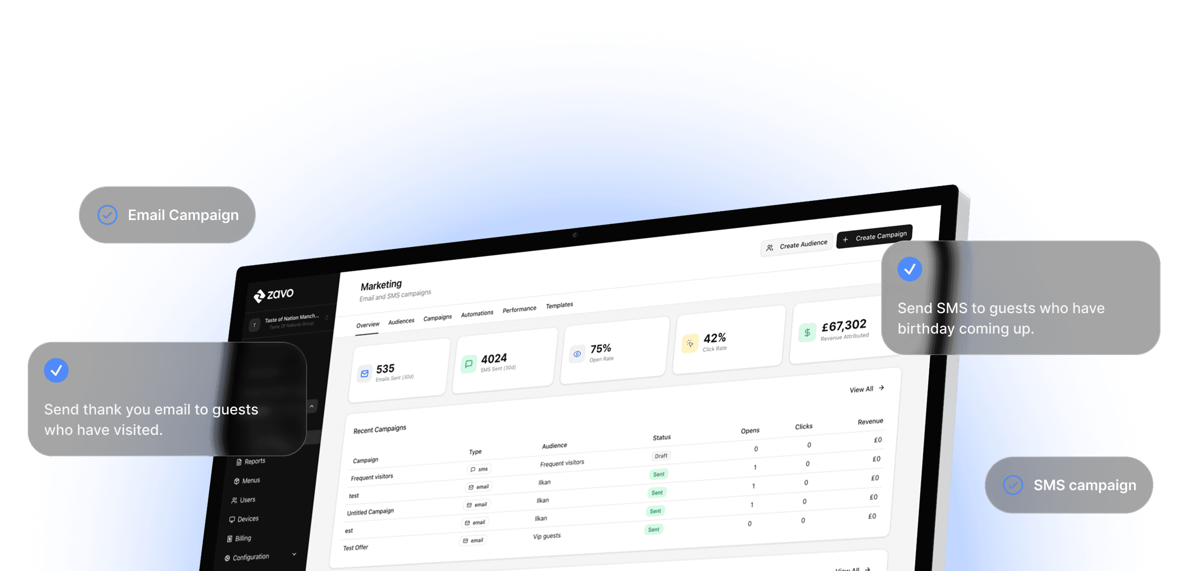 Create and send SMS and email campaigns from one place — with ready-made templates built for restaurants.