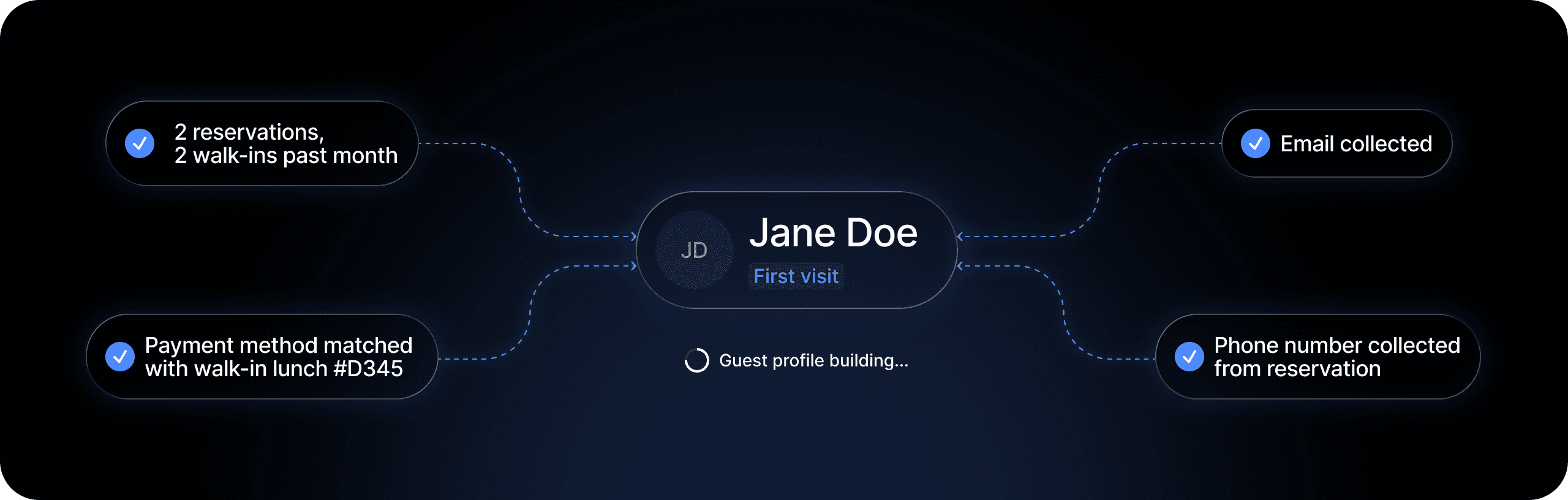 Every visit, spend, and preference stored automatically — a full guest database built without any manual work.