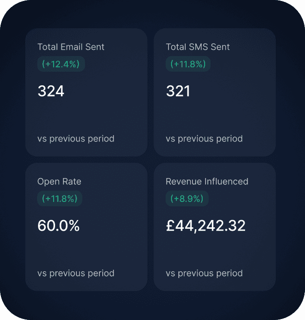 Track email and SMS performance, open rates, and revenue influenced — all in one clear dashboard.