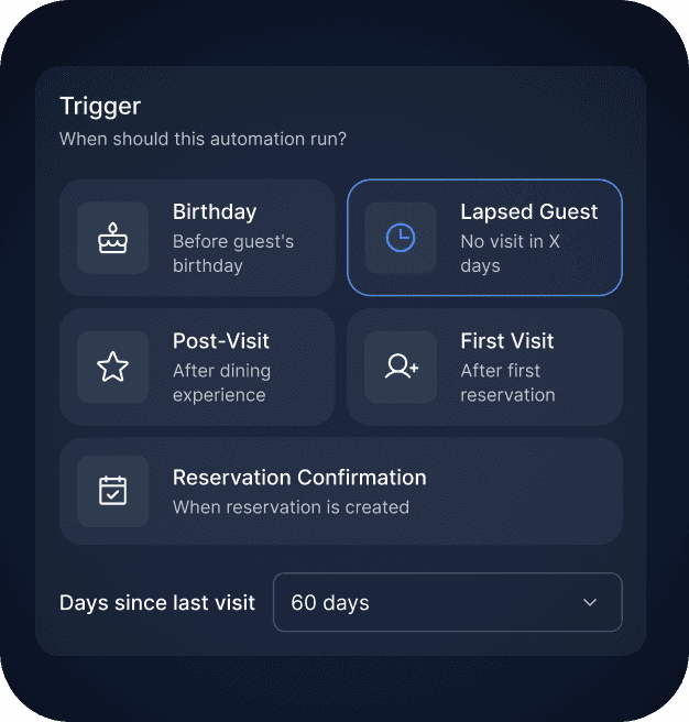 Build your own automation based on any guest behaviour — visit frequency, spend threshold, occasion, or anything else.